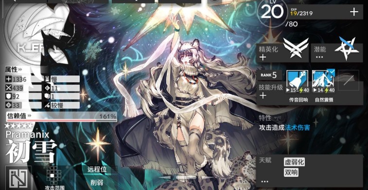 精二立绘一张,雪国圣女初雪哒。面板一看就是个脆皮,攻击也不高,精二有全游最高25法抗倒是个优点,就是个辅助。但也正因为她是辅助嘛,天赋与技能有增幅这是常识。攻击范围是围着自己一大圈,比杰哥的大多了,比守林人的小一点。配合天赋效果很好,典型的拐,但伤害可比术士。