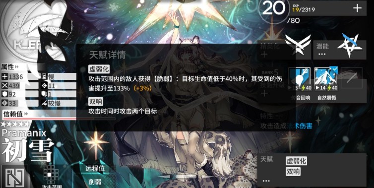 天赋一 虚弱化:额,类似于斩杀,残血迅速解决增伤的天赋,增的值其实不多,关注增长到133%,就是将攻击439(我的初雪)1.33=583.87。额,好像挺高的。