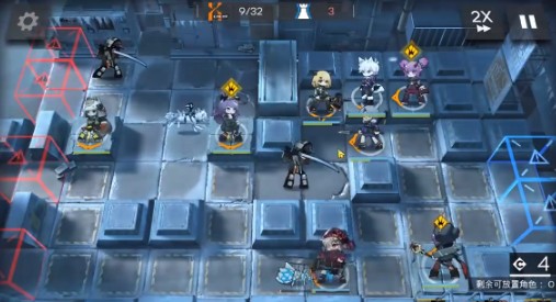 3.在地图左侧的高台摆一个朝下的阿消(一技能,不建议食铁兽,因为阿消可以推多个敌人);在阿消右边的高台摆一个朝下的暗索。二技能,可以用崖心替代。