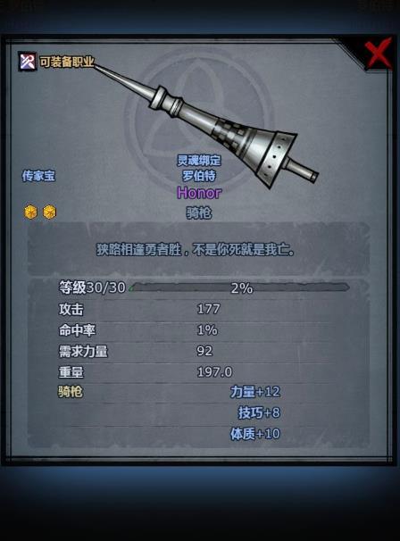 IV.重骑装备1.防具:牛头信赖三件套,瓦提肯盾牌。(考虑到负重加成以及格挡收益多方面因素,盾牌还是选了瓦提肯)强化:目前版本防具只能强化+1,但是NPC有许多防具是+6的。考虑到板甲带来的收益,一旦开放防具强化,重骑会成为更变态的兵种。2.武器:毁灭者骑枪(不要问我能不能打中,人物本身就有技巧带来的命中,武器相当于在人物命中上额外增加武器命中,只要人物技巧够了,不需要考虑武器命中)强化:毁灭者骑枪有一个非常特殊的强化优势,所有武器最低命中默认为1%,所以只要强化到命中率1%,继续强化就只加攻击不扣命中了。V.重骑技能1.主动技能(3选1)英勇冲锋:主动进入首次攻击,每移动一格伤害+45%。毁灭冲锋:主动进入首次攻击,根据负重的46%增加攻击力,且目标无法反击。冲撞:击飞目标1格,格局负重差的50%增加伤害。实测:英勇冲锋伤害最高。2.职业技能(1选1)蓄势铁骑:移动+1,每移动1格,伤害+20%,未移动伤害-50%。3.特性技能(3选1)强力打击:首次主动攻击时伤害增加2~6(**技能)强壮战马:负重增加30~135(过渡技能,前期装备穿不上时佩戴)惯性冲击:根据当前负重增加2%~4%(满装携带,额外增加17点攻击)4.被动技能(3选3)生命+20,负重+14,物攻+7VI.重骑的其他可能性1.皇骑转重骑,已测试。楼主1级3转皇骑升到39级转重骑。效果非常不错。转职理由是:重骑的防御不行,格挡太低,本身的三个被动技能过于无用。于是楼主先转了皇骑,吃增加格挡概率,增加格挡防御的被动。优势:大幅增加了在副本中的生存能力。劣势:小幅降低了对要塞的伤害力,另外,花钱如流水……2.刺客转重骑,未测试。屠戮技能永远会让人心动,但是考虑到职业成长与重骑偏差太大,不是很看好。3.铁甲转重骑,未测试。由于铁甲拥有和重骑完全相同的职业成长,所以1级转铁甲并不会损失任何属性点。而前期铁甲的重骑后期防御会高出20多点,具有很大的可能性。
