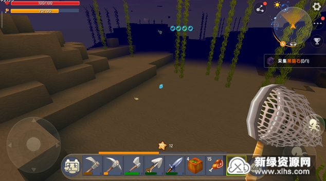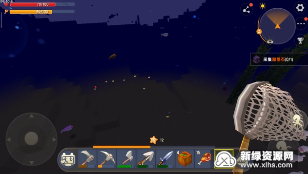 除了各种颜色的小怪鱼之外,大海中还有灯笼鱼和乌贼,不过乌贼都在海的最下面。当你到了海的最下面,走在平地上的时候,看到有一个地方在喷黑色的墨,那就是乌贼了。灯笼鱼的攻击性很强,它自己在海中的时候会攻击身边的小怪鱼,看到你之后还会咬你,如果你不能一下子就用捕鱼网将它变成道具的话,那就只能拿出背包中的武器把它击杀了,我们在大海中还能看到水草和海带,这些都能够用剪刀拿回家,剪刀也是在工具箱中合成的,主要用到的物品是精铁锭。