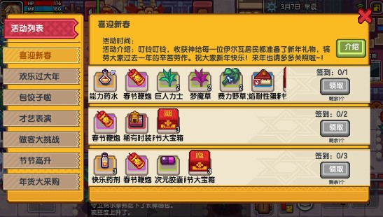 为了感谢冒险家这一年来的关照,我们也准备了活动:喜迎新春、才艺表演、年货大采购等7大节日挑战等待着大家的参与,同时,也会送出年味饺子、春节大宝箱、春节鞭炮、稀有时装等奖励哦~