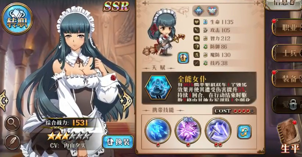 配合“超养成计划”自我免疫固伤的必须兵种,同时还能射程+1,和梅雅一样都属于‘女仆’可谓梅雅的标志兵种。