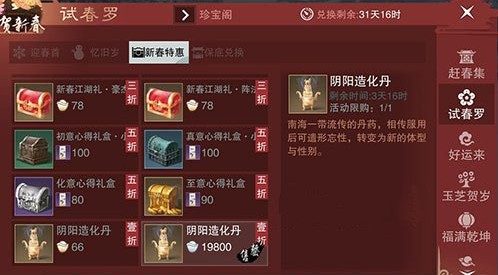 玩家们首先进入商城然后找到试春罗,之后在新春特惠里面就能直接购买阴阳造化丹了