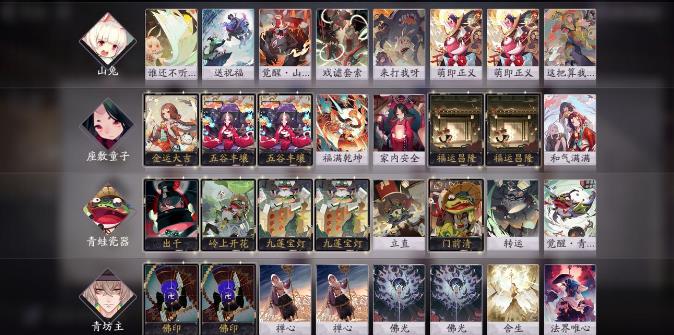 犬神 4守护或者4归心桃花4桃之夭夭、判官2觉醒+2无情+生死无常+2墨笔夺魂+勾绝酒吞2觉醒+鬼王+神子+2醉里乾坤+无尽冲锋。