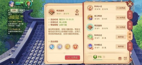 每晚8点10分的帮派宴席也是前期升级的一个好方法,动动手指点点桌子上的食物,既能升级又能拿帮贡。