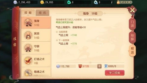 其实,大多数帮贡都用在学习帮派技能上,强身、冥想和守御等等,这些技能对应的效果分别是效果分别是血量、蓝量、物防法防。