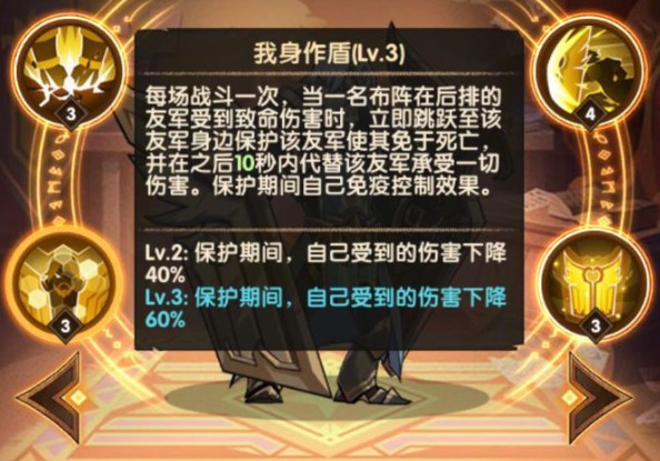 每场战斗一次,当后排友军收到致命伤害时,立即跳跃到该友军面前保护其免于死亡,并在后续10秒内替代该友军承担一切伤害,保护期间自己免控,受到伤害下降60%。这个技能是后排免死神器,相当于多了一条命,往往很希望尽快触发这个技能,因为它给亨德里克提供的伤害减免也太高了。