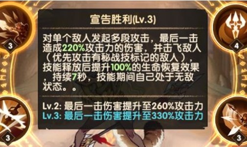 一、‘宣告胜利’安丹德拉对单个敌人发起多段攻击,最后一击造成330%攻击力的伤害,并击飞敌人(优先攻击有秘战技标记的敌人),技能释放后提升100%的生命恢复效果,持续7秒,技能期间自己处于无敌状态。这个作为安丹德拉的核心技能对于一个次要定位为爆发的英雄来说简直是一个非常恐怖的,并且有着霸体状态让人真是没有办法。