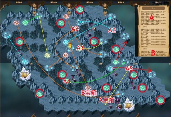 2、想要获得B宝箱需要玩家将地图中所有的绿色月亮标记都踩过依次之后,再踩任意一个绿色月亮标记即可传送到B宝箱的位置,如果玩家没有全部踩亮绿色月亮标记的话,踩已经亮起的绿色月亮标记会回到起点。