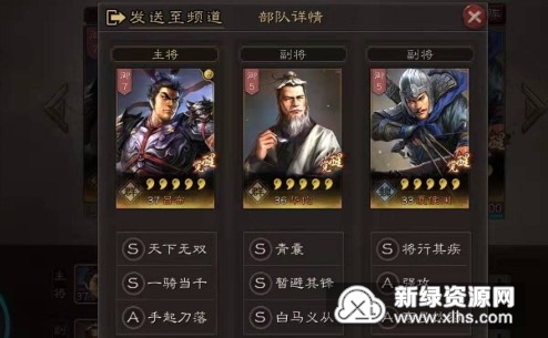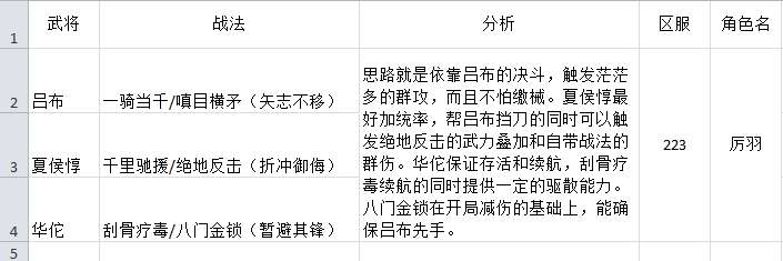 思路就是依靠吕布的决斗,触发茫茫多的群攻,有效地压制敌人兵力。这阵容不怕缴械,夏侯惇最好加统率,帮吕布挡刀的同时可以触发绝地反击的武力叠加和自带战法的群伤。华佗保证存活和续航,刮骨疗毒在续航的同时提供一定的驱散能力。八门金锁在开局减伤的基础上,能确保吕布先手。